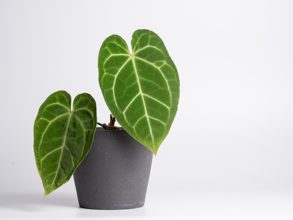 The Anthurium Clarinervium is a rare and highly prized houseplant known for its large, dark green leaves with striking white veins. This plant thrives in bright, indirect light and requires a humid environment to flourish. The heart-shaped leaves are the focal point of the plant, giving it a dramatic appearance that stands out in any collection. It prefers consistently moist soil, but overwatering can lead to root rot, so it’s essential to strike the right balance.