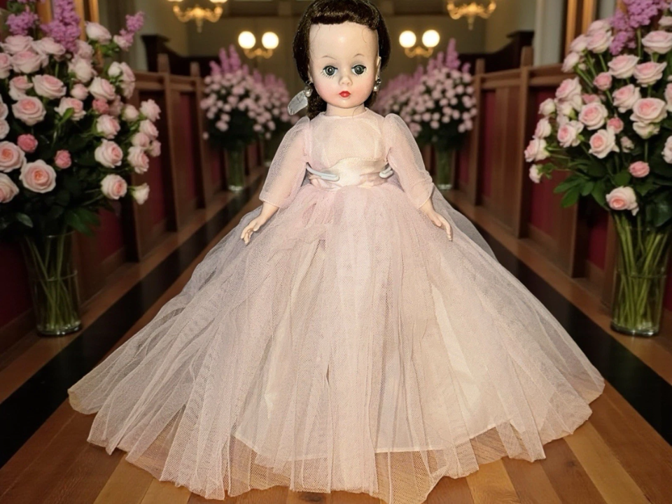 This figure is a smaller bridal themed release that stands out because it shows the variety of roles dolls played in celebrations in mid-century life. The pink bridal attire gives it a look that feels both formal and sweet. Cissette figures were popular because they were compact yet detailed enough to display in a cabinet or shelf. Dolls that stay in original clothing and finish hold higher values because many were dressed and redressed by owners.