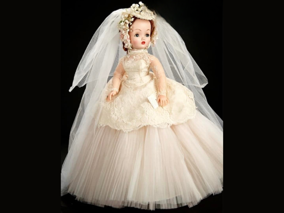 This doll was released in the mid twentieth century to honor a famous television star who was beloved for her lively personality and comic timing. The figure wears an elegant bridal gown that has held up well over decades when it is in original condition with its accessories and tag. Few examples of this model remain in excellent condition because the fabrics and materials used have become fragile with age.
