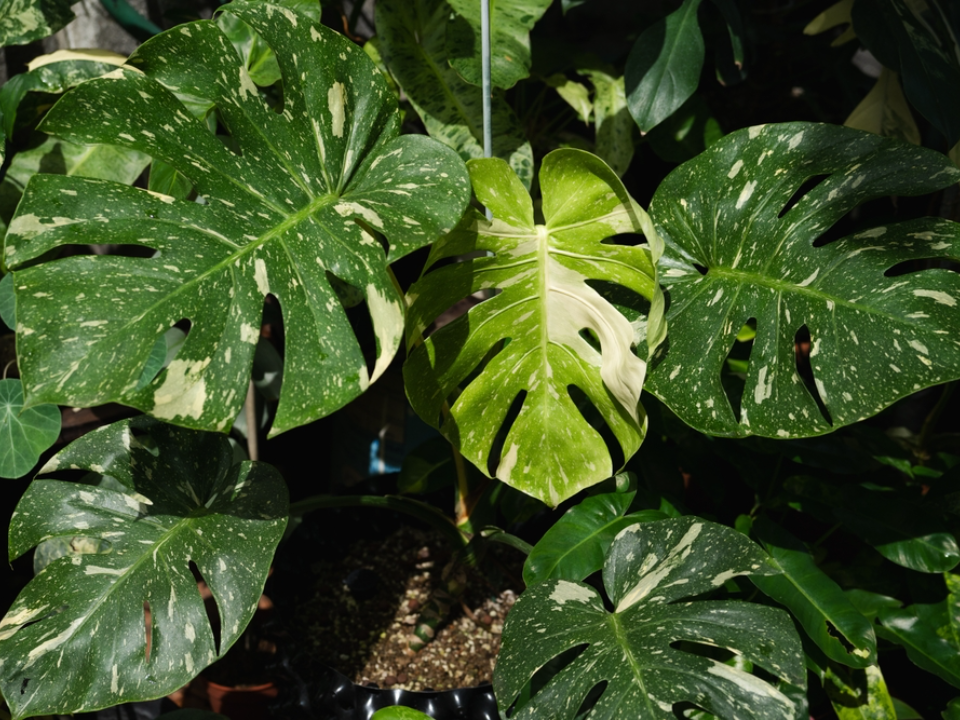 The Monstera ‘Thai Constellation’ is a stunning variegated variety that boasts creamy white patches and speckles across its dark green leaves, resembling a starry sky. Unlike the classic Monstera, this variety has more irregular variegation, with some leaves featuring large, blotchy white sections, while others have fine speckles of white throughout. This rare plant is highly prized by collectors and often commands high prices due to its unique appearance and difficulty in propagation.