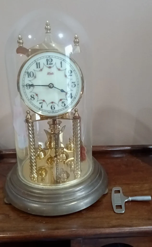 The Kundo anniversary clock was admired for its elegant movement. Its brass base and rotating pendulum sat beneath a glass dome, creating a graceful centerpiece. It was called a 400-day clock because it could run for more than a year on one winding. Many were given as wedding gifts or anniversary presents.