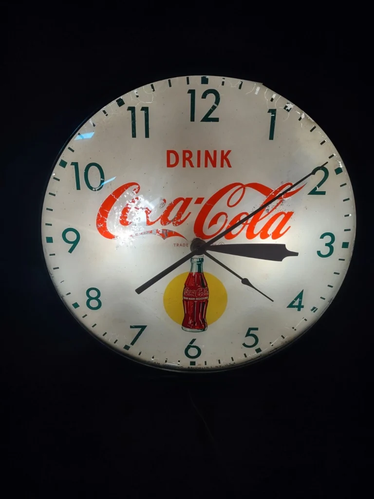 Coca-Cola advertising clocks were everywhere in the 1950s, from diners to corner stores. Produced by Pam Clock Co., these backlit models glowed with soft neon-like light. The clear glass faces and bright logos created an inviting atmosphere. They were both marketing tools and functional décor.