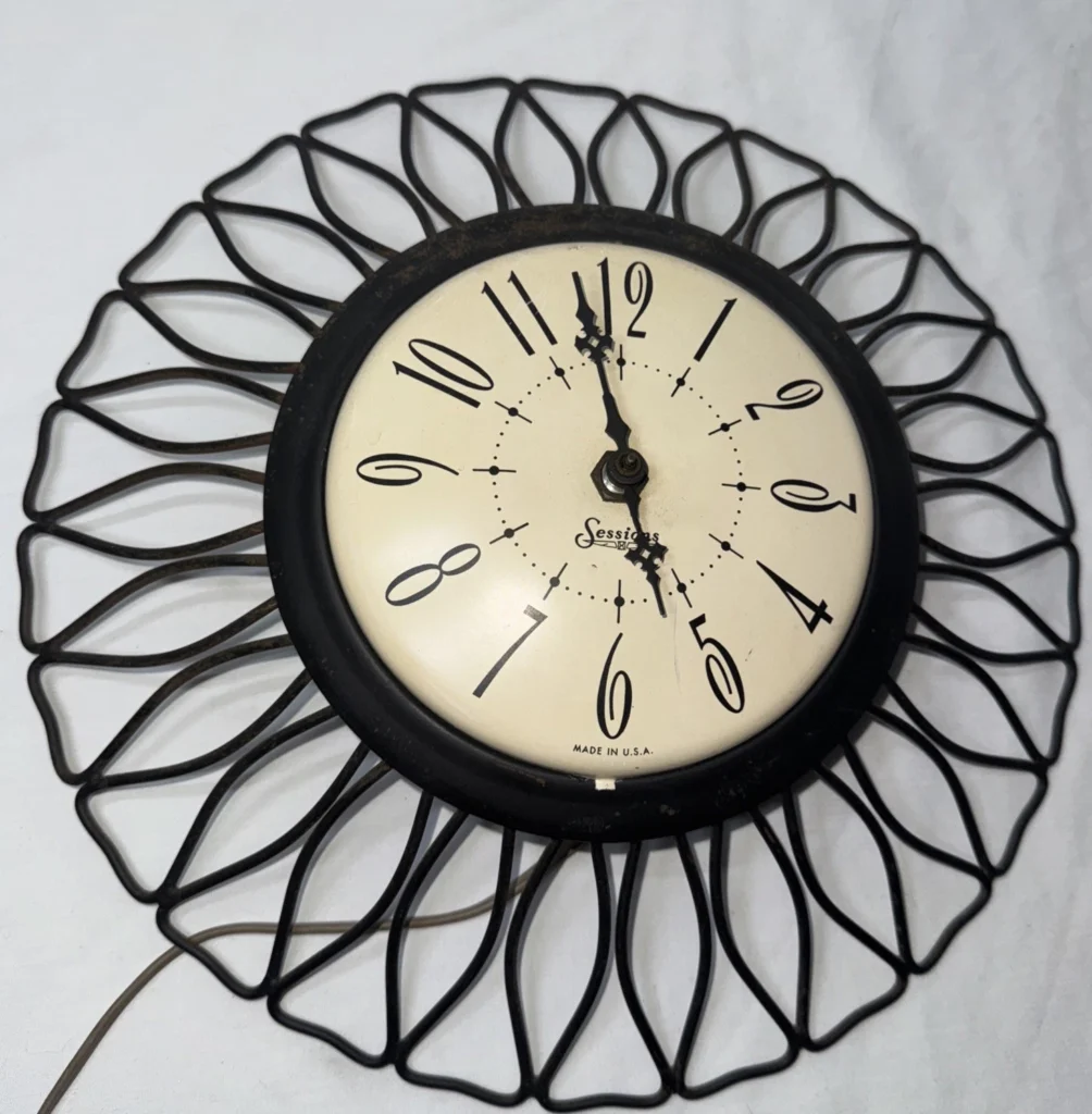 Sessions produced many variations of starburst clocks that reflected atomic-age energy. Their combination of wood, metal, and brass tones gave walls a dynamic look. The geometric shapes symbolized progress and style during the 1950s. These clocks were both decorative and practical.