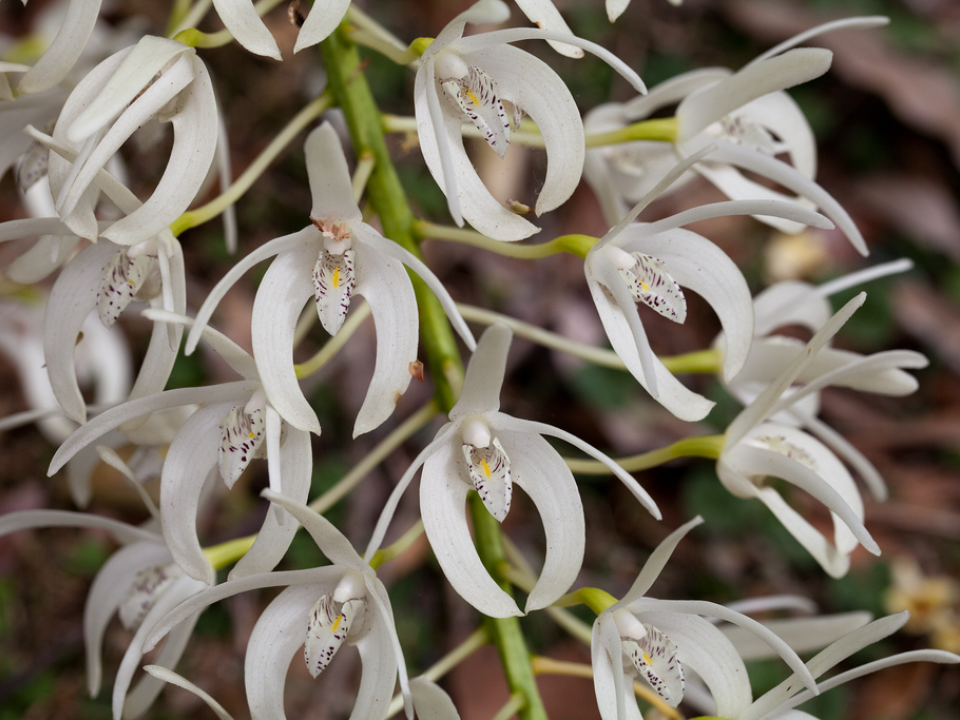 The Snow Orchid, native to parts of Australia, is known for its stunning white flowers that bloom in clusters. This orchid species grows in a wide variety of habitats, from forests to rocky outcrops, where it thrives in both sunny and shady conditions. The Snow Orchid’s flowers have a striking, pure white appearance, and its delicate blooms make it a favorite among collectors. It is pollinated by bees, which are attracted to the flowers’ fragrance and nectar.