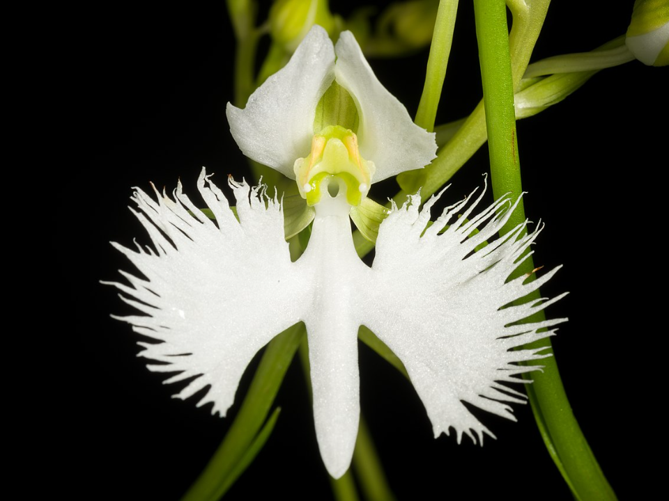 The White Egret Orchid, found in Japan and parts of China, is a stunning flower that resembles an elegant egret bird in flight. Its long, delicate white petals fan out like wings, making it one of the most visually striking orchids. This orchid thrives in humid, shaded environments and blooms during the summer months. It is pollinated by moths, which are drawn to its subtle fragrance. The