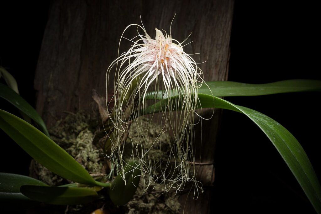 When it blooms, a starry white flower with long lower lobes seems to float against the dark swamp background. The narrow lobes hang like legs and make the blossom look like a small figure in mid jump. In cultivation, it needs mounting on bark, very high humidity, and constant but gentle air movement. Because its roots are exposed, growers water lightly and often, taking care that the plant does not sit in still, stagnant moisture.