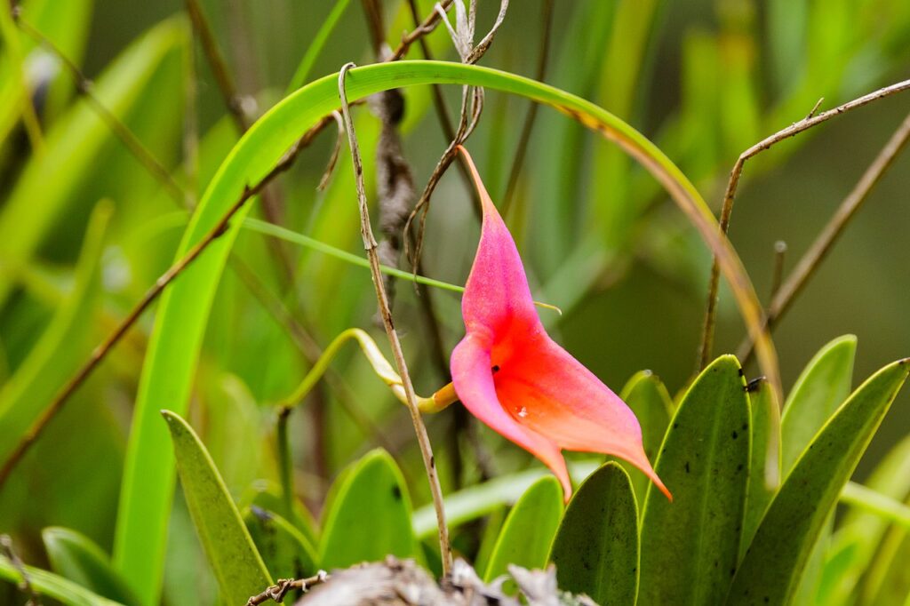 Mountain slopes near Machu Picchu in Peru carry Masdevallia veitchiana on rocky ground and grassy ledges. Its triangular flowers glow with bright orange and red tones that can shimmer in changing light. Each bloom has three main segments that join at the center, then extend into long narrow tails. Cool days, cold nights, and clean, moist air define the climate it prefers.