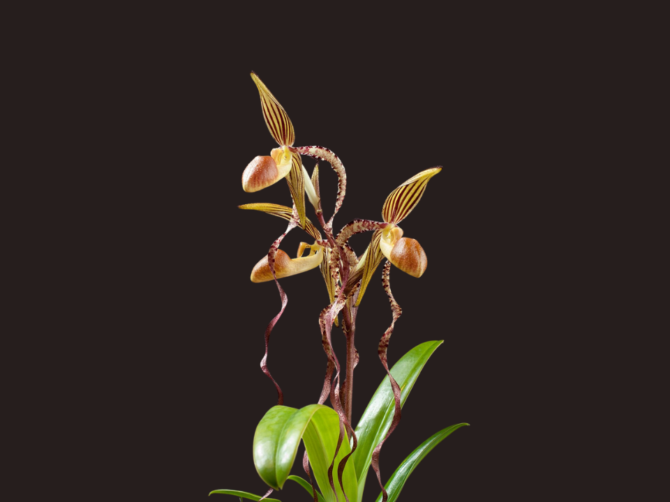 On limestone cliffs and forested hills in northwestern Borneo, Paphiopedilum sanderianum grows in pockets of moss and leaf litter. This slipper orchid is famous for its extremely long, narrow side petals that can reach impressive lengths. The central pouch forms the typical slipper shape, while the dorsal sepal stands tall and striped. Warm to intermediate temperatures and steady humidity match its native slopes.