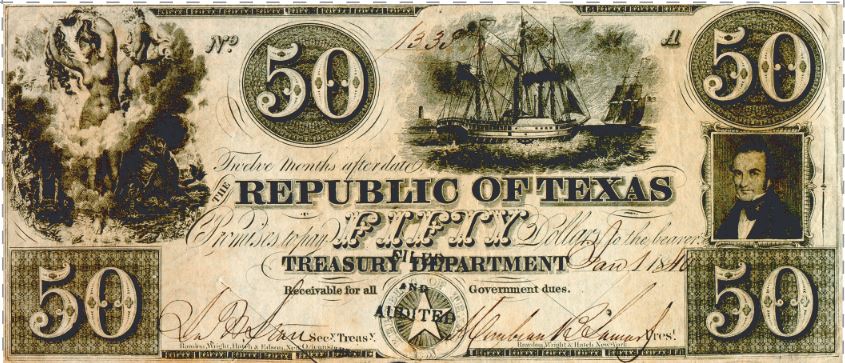 Issued by the Republic of Texas during its brief existence as an independent nation between 1836 and 1845, this $50 bill was part of an attempt to create a functioning economy. After Texas became a state in the United States, the currency quickly lost value and was largely replaced by U.S. dollars. Due to the short lifespan of the Republic, very few of these bills remain in circulation today. The value of a high-grade $50 bill from the Republic of Texas ranges from $3,000 to $10,000.