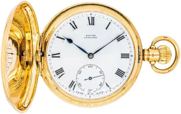 This watch comes from the brand Baume and Mercier and dates to the early 1900s. The solid 18-carat gold case and fine Swiss movement create a rarity among gold-cased Swiss pocket watches of this period. It is reported to keep time, which is significant for its age. On current market listings similar items might fetch around US$5,000-10,000 depending on condition. Given the less extreme prices compared to ultra-high-end makers, this model offers an accessible entry into rare early 20th-century gold pocket watches.
