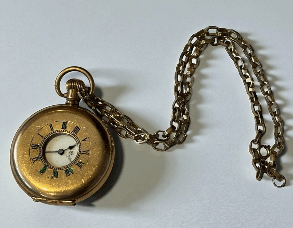 This pocket watch dates to around 1900, features a gold-plated case and half-hunter design (window on the lid to view the dial). It is rarer than many gold-filled models because gold plating was less common at luxury levels then, and survivors in working condition are fewer. Market value for such gold-plated watches in good order can be in the region of US$1,000-3,000, though maker and condition could push price higher. It remains ticking which adds operational appeal for a watch of its era. The half-hunter style gives it a distinctive look while preserving protection of the dial.