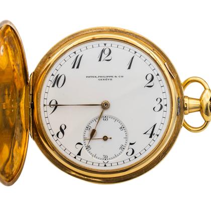 Made around 1915, this Patek Philippe piece features a hunter-case (lid covering the dial) in 18-carat yellow gold. The combination of high-quality maker, full gold case and period hunter design makes it rare in an increasing market of survivors. It is reported to still run, which enhances its collectible status. Market value for this type of item is in the region of US$400,000-700,000 depending on size, condition, provenance and complexity. Collectors especially prize such pieces when they include period chain or presentation case.