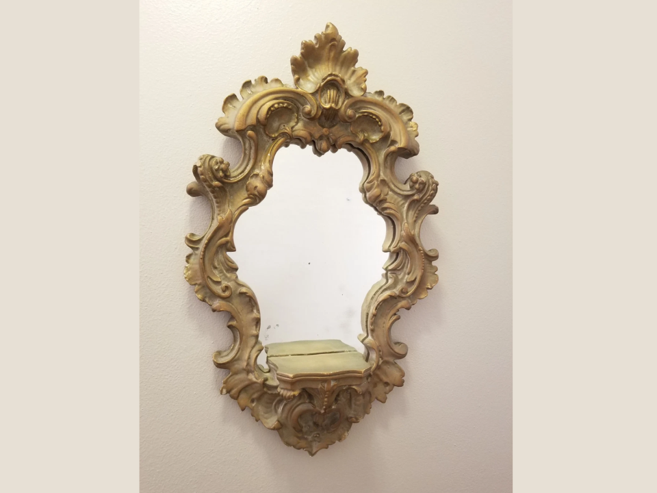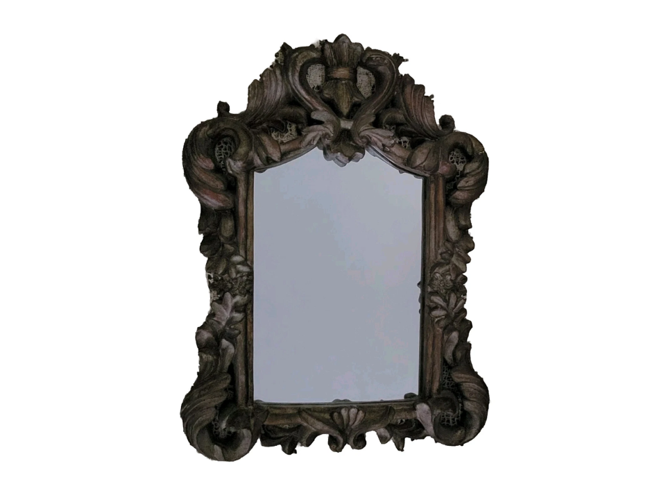 This Rococo mirror is known for its deep, intricate scrollwork that wraps around the frame, creating a feeling of movement and elegance. The frame’s design is composed of organic curves that flow into each other, often accented by flowers and leaves that seem to grow from the center. The overall effect of this mirror is one of delicate luxury, making it a statement piece in any room.