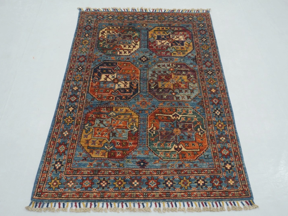 An Afghan Bokhara rug is characterized by its repeating guls (diamond-shaped motifs) and rich, earthy colors, including shades of red, maroon, and blue. Originating from the nomadic tribes of Afghanistan, these rugs have a tight weave and are often made from wool dyed with natural materials. Bokhara rugs are known for their durability, making them an excellent choice for high-traffic areas while still offering a rich, traditional look.