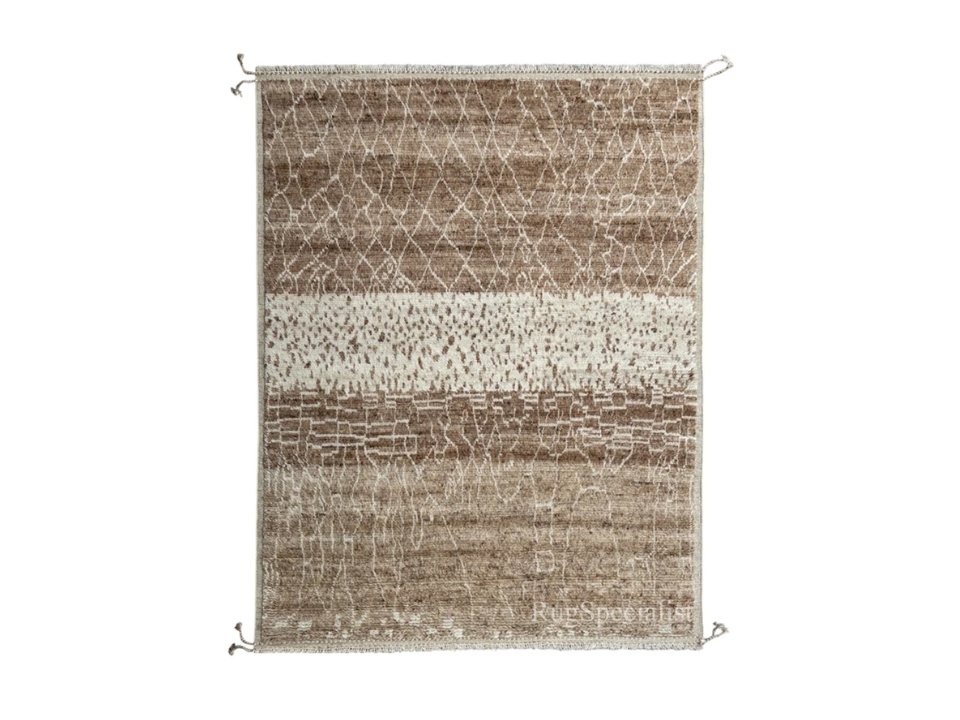 A Moroccan Beni Ourain rug is known for its simple yet striking design that often consists of black or brown lines set against an ivory background. These rugs are made by the Berber tribes in the Atlas Mountains of Morocco and are renowned for their minimalistic geometric patterns and thick, woolen pile. Beni Ourain rugs are highly valued for their soft texture and the way they naturally add warmth to a room, making them perfect for cozy spaces.
