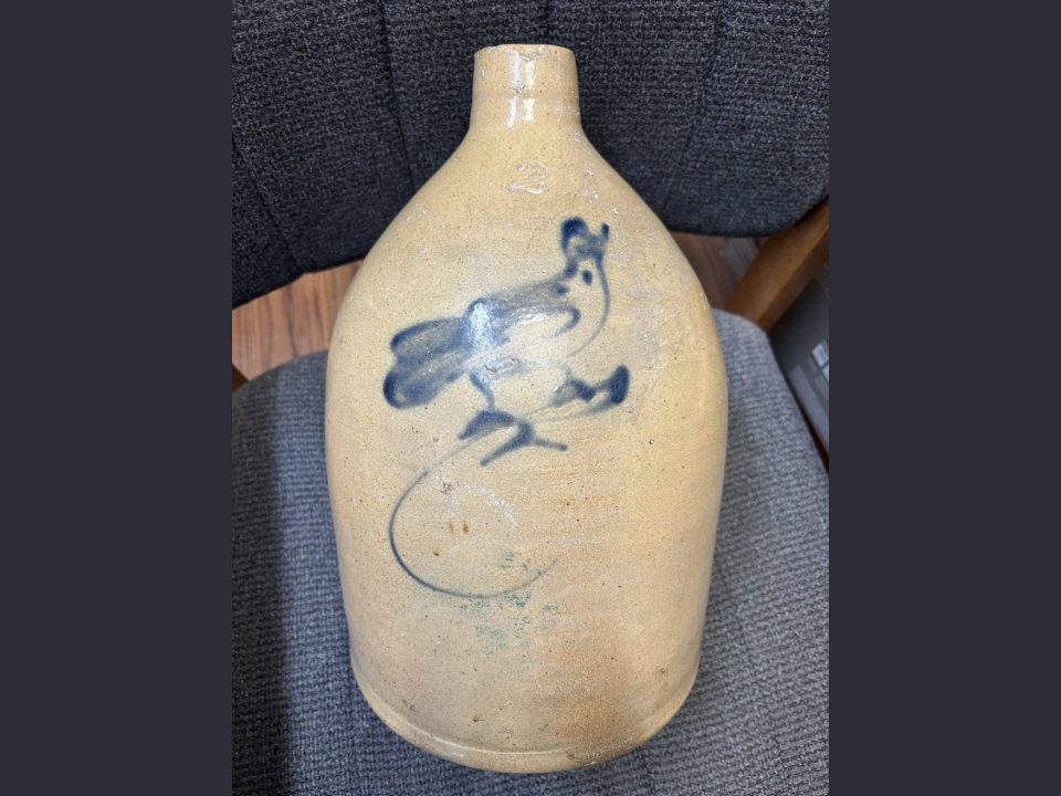 The bird motif is a typical feature in American salt-glazed stoneware, with artisans often using freehand cobalt painting to add personality to their pieces. These jugs are often considered valuable due to their combination of folk art elements and historical appeal, with prices generally ranging from $500 – $800 depending on the size and the clarity of the artwork.