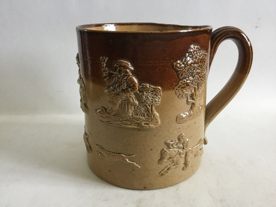 This English tankard from the 18th century is a testament to the early salt-glazing techniques employed by potters. It features a simple yet elegant design with a slightly curved body and a sturdy handle.