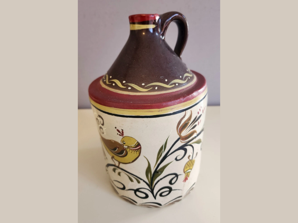 The jug’s appeal lies in its historical significance as a utilitarian piece made with high-quality craftsmanship. Pennsylvania Dutch pieces remain highly collectible, with prices generally ranging from $700 – $1,500 depending on condition and the complexity of the decoration.