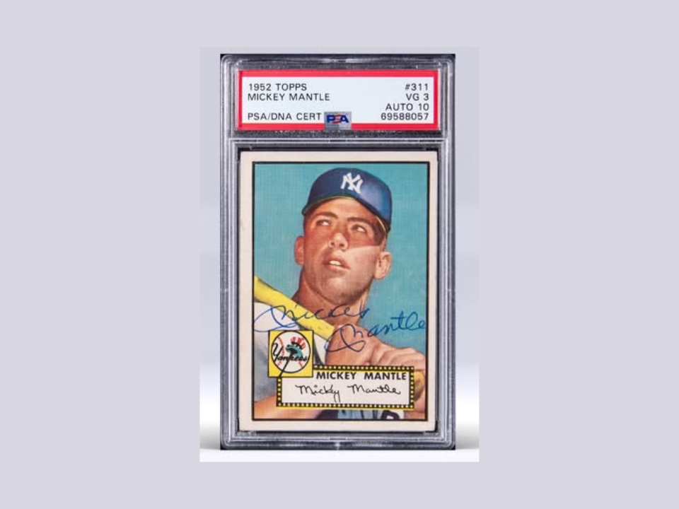 Mickey Mantle’s 1952 Topps rookie card is one of the most iconic baseball cards in history. The card features Mantle’s early days with the New York Yankees and includes his signature, making it incredibly valuable to collectors. This card is authenticated by PSA/DNA, ensuring that Mantle’s signature is genuine.