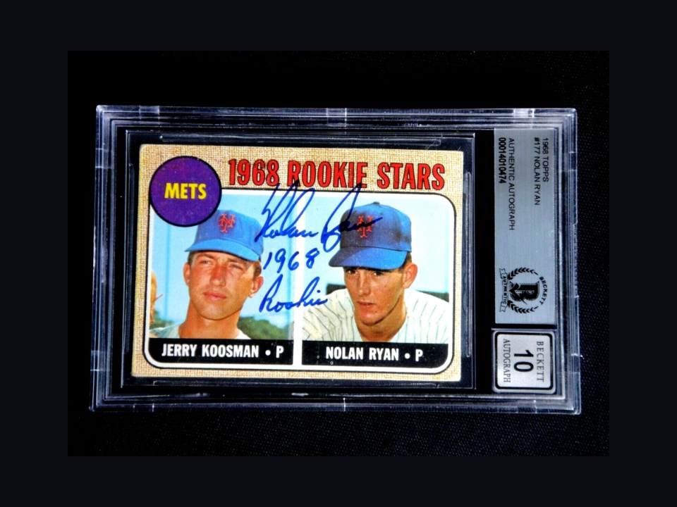 Nolan Ryan’s 1968 Topps Autograph card is a must-have for baseball card collectors. Known for his legendary career as a pitcher, Ryan holds numerous records, including the most strikeouts in MLB history. This particular card is from Ryan’s early days with the New York Mets and features his signature, which has been authenticated by JSA.