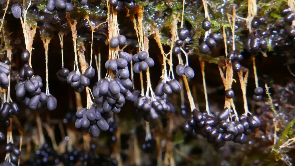 Native to North America, Europe, and Asia, it thrives in moist, shaded environments. The fruiting bodies, resembling little bags of spores, are often found in humid forests. This shrub grows quickly and forms intricate networks, much like the movement of a brain. Its behavior, rapid spread, and adaptation to its environment make it a fascinating specimen.