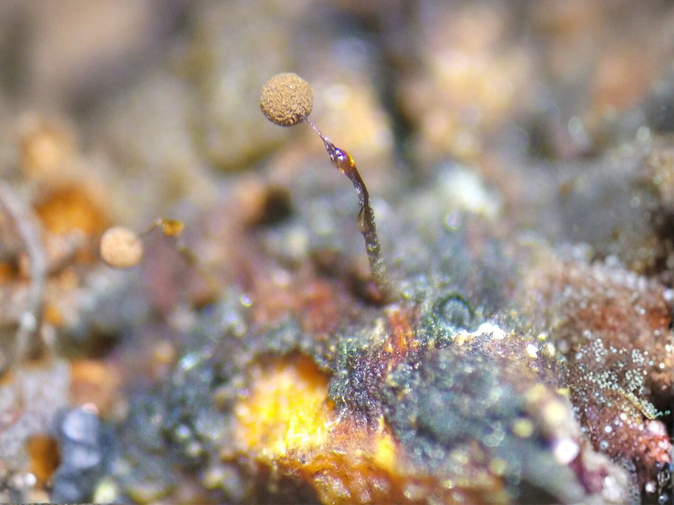 This slime mold is a rare species that forms small, dark pores on decaying wood. It is recognized for its ability to move and grow toward areas with rich nutrients, responding to environmental stimuli in ways that seem like decision-making. This slime mold exhibits complex behaviors that are rare among slime molds, as it moves in an organized, almost intelligent manner. Its white, dot-like fruiting bodies are small but striking, making it a unique specimen to study.