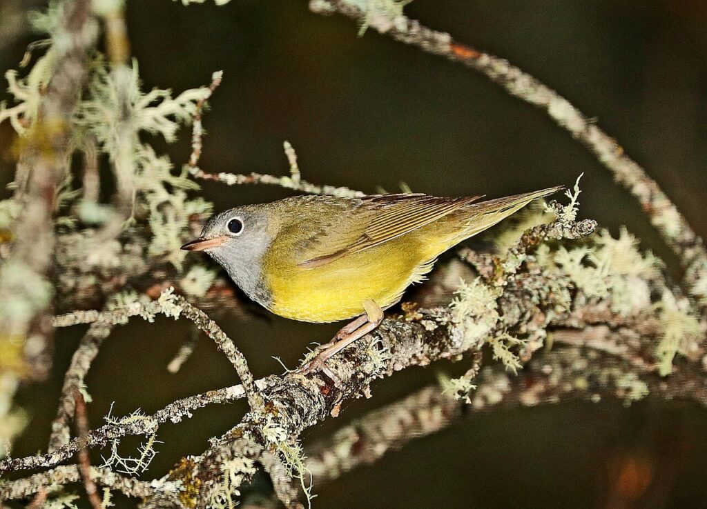 Mourning Warbler has a rolling, musical song that can sound louder than such a small bird has any right to produce. In spring, males sing from brushy clearings, regenerating woods, and thick roadside growth where leaves and stems hide them well. The bird often stays low or slips between cover, so people hear the song first and then spend several minutes trying to pin down the source. That little chase is part of what makes it memorable.