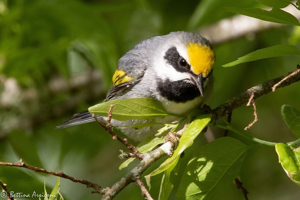 Golden-winged Warbler has a thin, buzzy song that can carry from brushy fields and forest edges before the bird shows itself. It often sings from shrubs, saplings, or low trees, though spring cover can still make it easy to miss. Its gray body, black throat, and yellow wing patch give it a striking look once you finally find it. Until then, the voice is usually what pulls your attention first.
