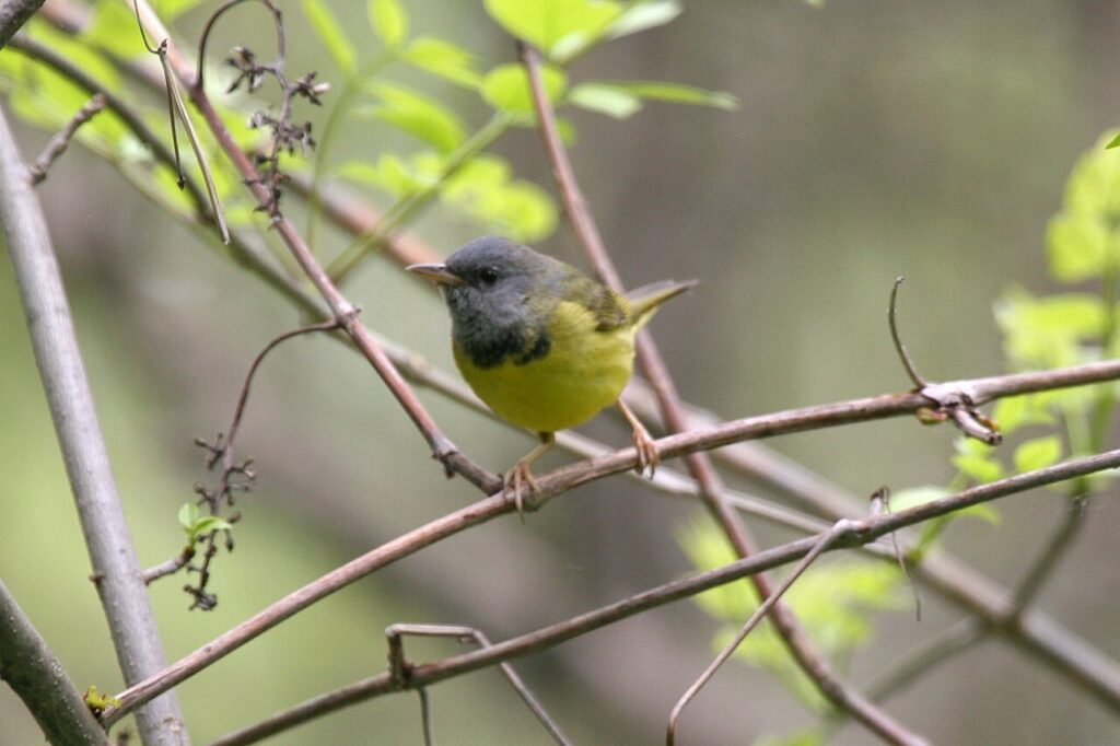 The male has a gray hood and dark throat patch framed against yellow underparts. Females are plainer, which makes sound even more important for finding them. This species often shows up in places that look messy or overlooked, especially after disturbance creates fresh growth. A warm May morning with a clear song coming from dense brush is exactly the kind of setting where Mourning Warbler turns up.