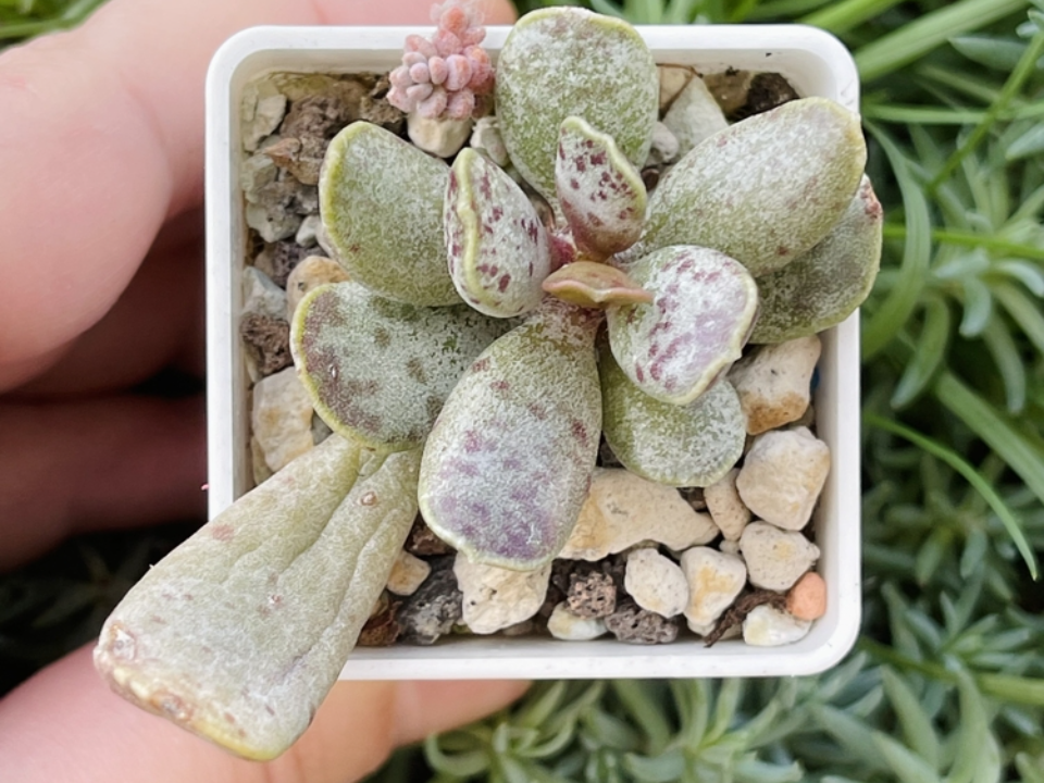 Adromischus cooperi, also known as Plakkie, is a small, low-growing succulent with thick, fleshy, oval-shaped leaves that feature a striking variegated pattern. The leaves are often green with purple spots, which create a unique, mottled effect. This succulent grows in a compact rosette shape, and its small size makes it ideal for rock gardens or as a ground cover in succulent arrangements.
