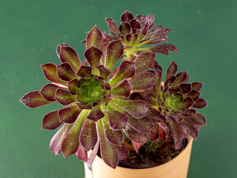 Aeonium ‘Zwartkop,’ commonly known as Black Rose, is a striking succulent with dark purple to black leaves that form a symmetrical rosette. The plant’s unique color gives it an almost mysterious and exotic appearance, making it a favorite among succulent collectors. Its dark leaves stand out dramatically against its bright yellow flowers, which bloom in the late winter or early spring.