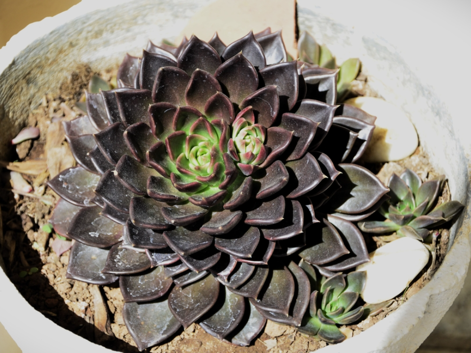 Echeveria ‘Black Prince’ is a striking succulent with dark, almost black, leaves that form a rosette shape. As the plant matures, the outer leaves develop a deep purple hue, giving it a dramatic appearance. This succulent thrives in bright, indirect light and requires well-drained soil. The rosette shape is both elegant and sculptural, making it a popular choice for modern arrangements or desert-style gardens.