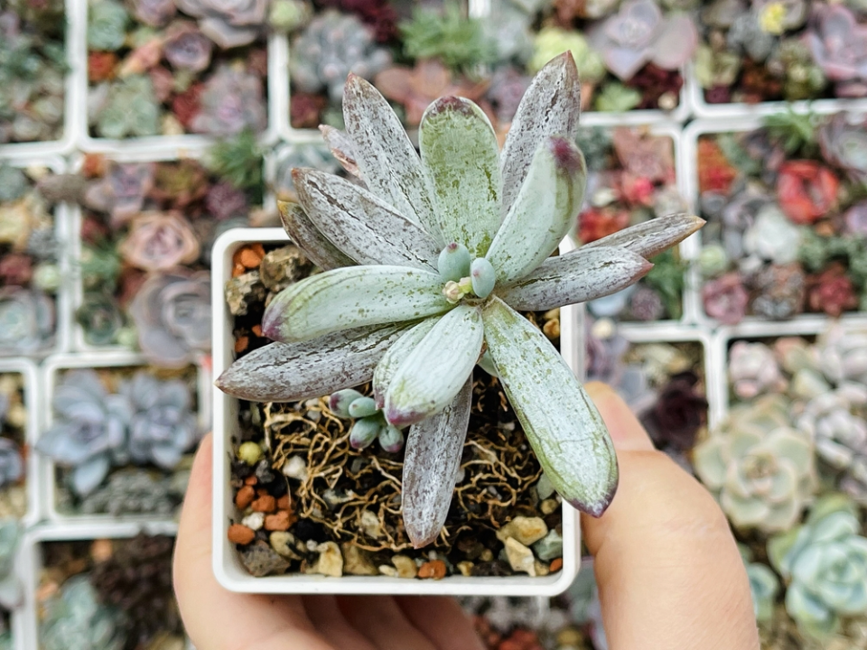 The Graptopetalum paraguayense, or ghost plant, is a succulent with soft, pale blue-green leaves that almost seem to glow in the sunlight. This plant’s colors range from light silver to pale blue, with an otherworldly look that gives it the “ghost” appearance. The leaves are thick and plump, growing in a rosette pattern that radiates from the center. The Ghost plant is particularly striking when grown in clusters or as a trailing plant, where its ghostly pale leaves cascade over the edges of pots or hanging baskets.