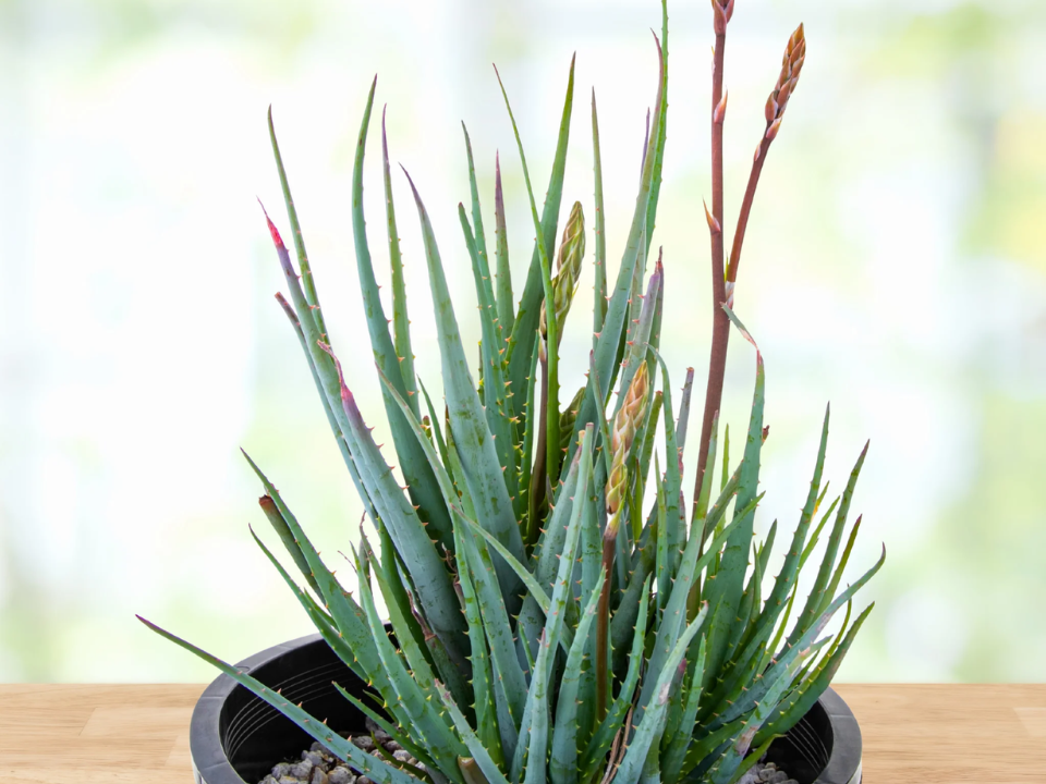 Aloe ‘Blue Elf’ is a smaller aloe variety known for its compact, sculptural shape. This succulent features thick, fleshy, blue-green leaves that are spiky at the edges, forming a rosette pattern. When the plant blooms, it produces bright orange flowers that contrast beautifully with the blue-green leaves, creating a striking visual effect.