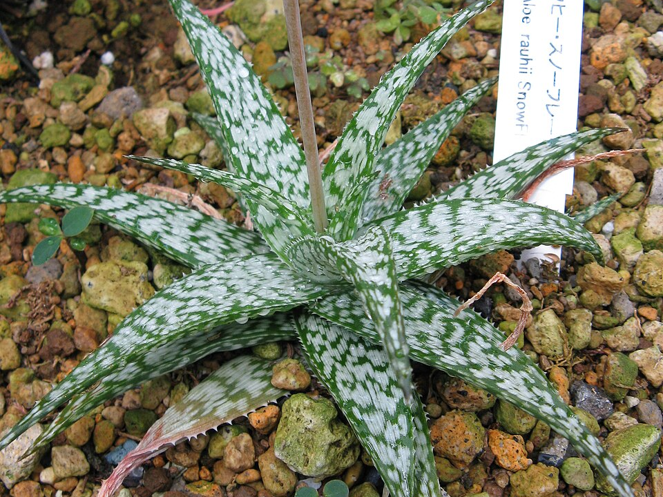 Aloe ‘Snowflake’ is a rare aloe variety known for its symmetrical, fan-shaped leaves that grow in a rosette pattern. The leaves are pale green with white spots and edges, creating a striking contrast that makes the plant resemble a snowflake. Native to South Africa, Aloe ‘Snowflake’ thrives in well-draining soil and bright, indirect light.