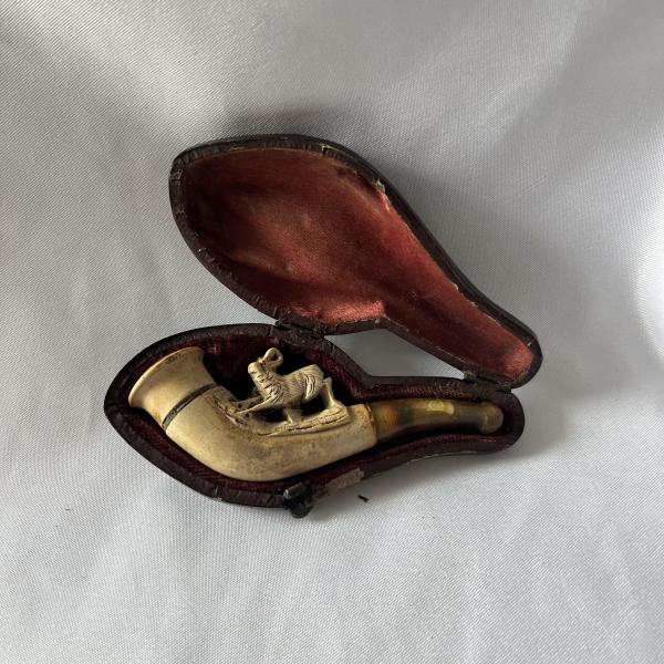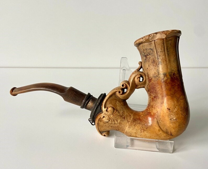This pipe, made from meerschaum and featuring an amber stem, was crafted in the late 1800s. The fine carvings and amber stem make it a rare and valuable find, with prices for well-maintained models ranging from $1,000 to $2,000 USD. The rarity comes from both the age and the delicate material, with many of these pipes no longer in existence due to wear and breakage. Meerschaum’s popularity during this period for its smooth smoking qualities adds to its appeal. The combination of artistic carving and amber, a fragile material, makes it a prized collectible.