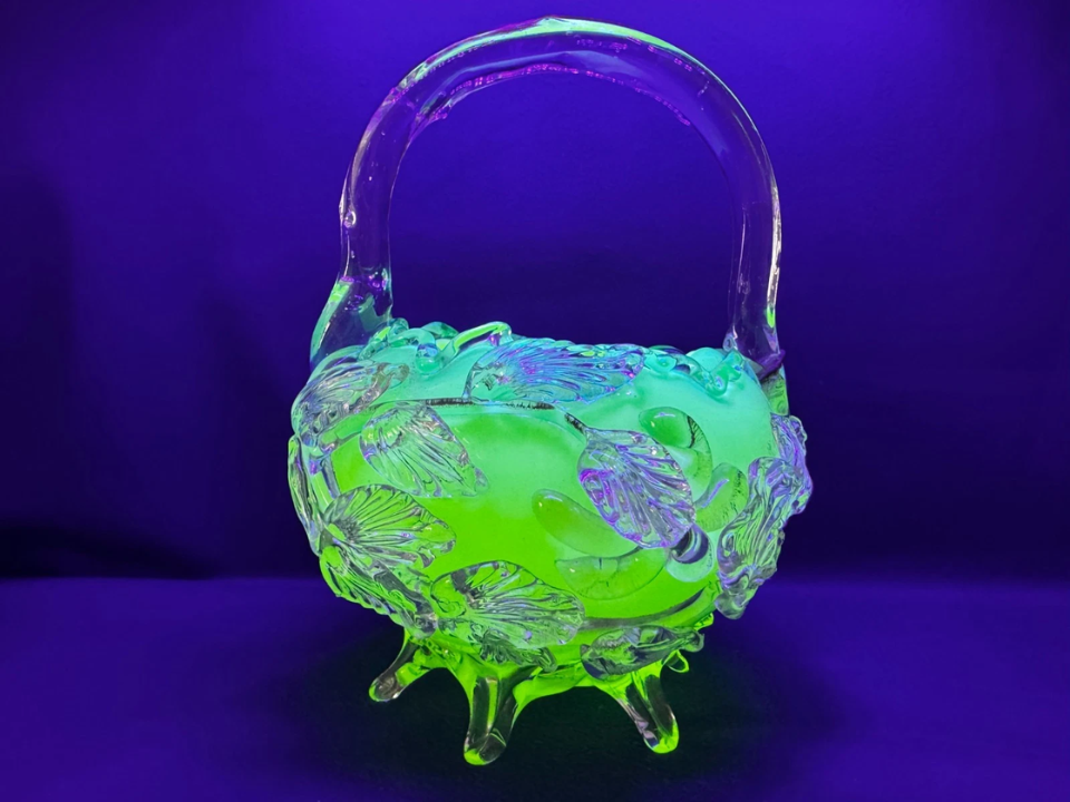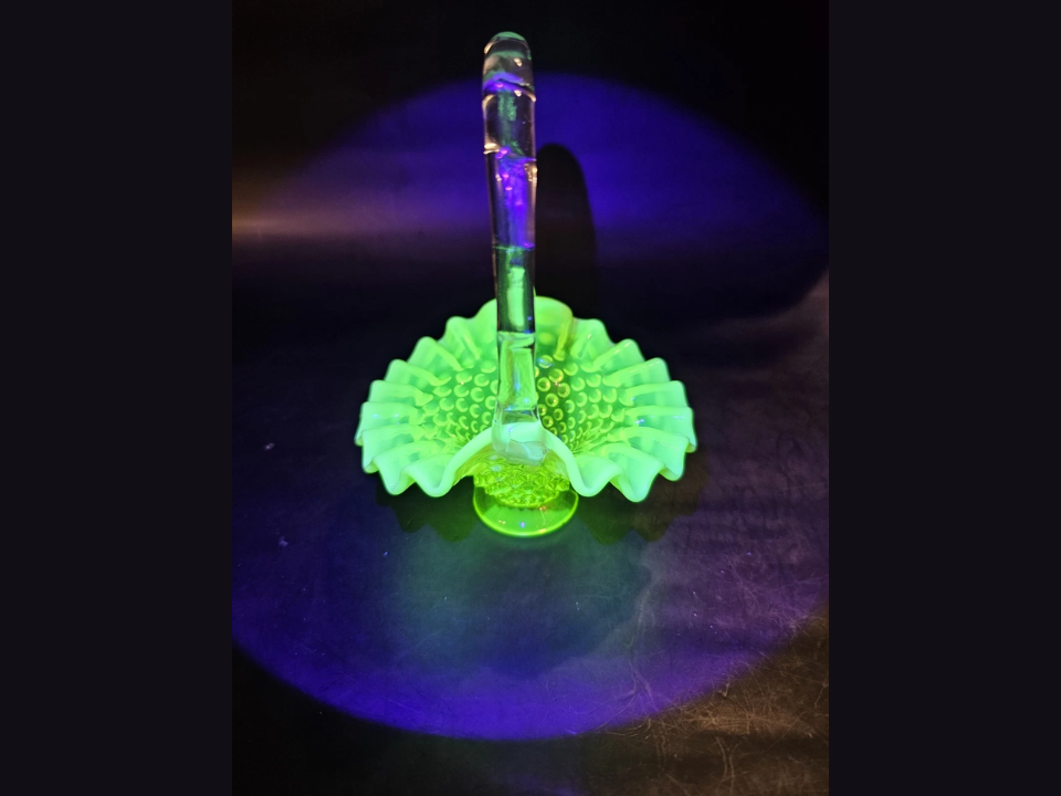 Description: The Fenton Hobnail basket is a standout piece among uranium glass collectors due to its intricate hobnail pattern. This beautiful basket has a delicately ruffled edge and a textured surface that showcases the distinct design of Fenton glassmaking. When exposed to UV light, the uranium glass emits a vibrant green glow, highlighting both the pattern and the glass’s unique properties.