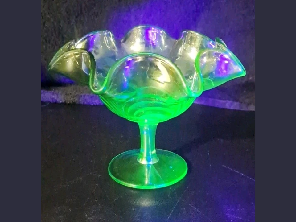 Description: This pedestal bowl is an elegant example of uranium glass, offering both functional use and collectible value. The bowl stands tall on a finely crafted pedestal, with smooth, rounded edges and a slightly scalloped rim. When exposed to UV light, the uranium glass gives off a brilliant glow that enhances the beauty of the piece.