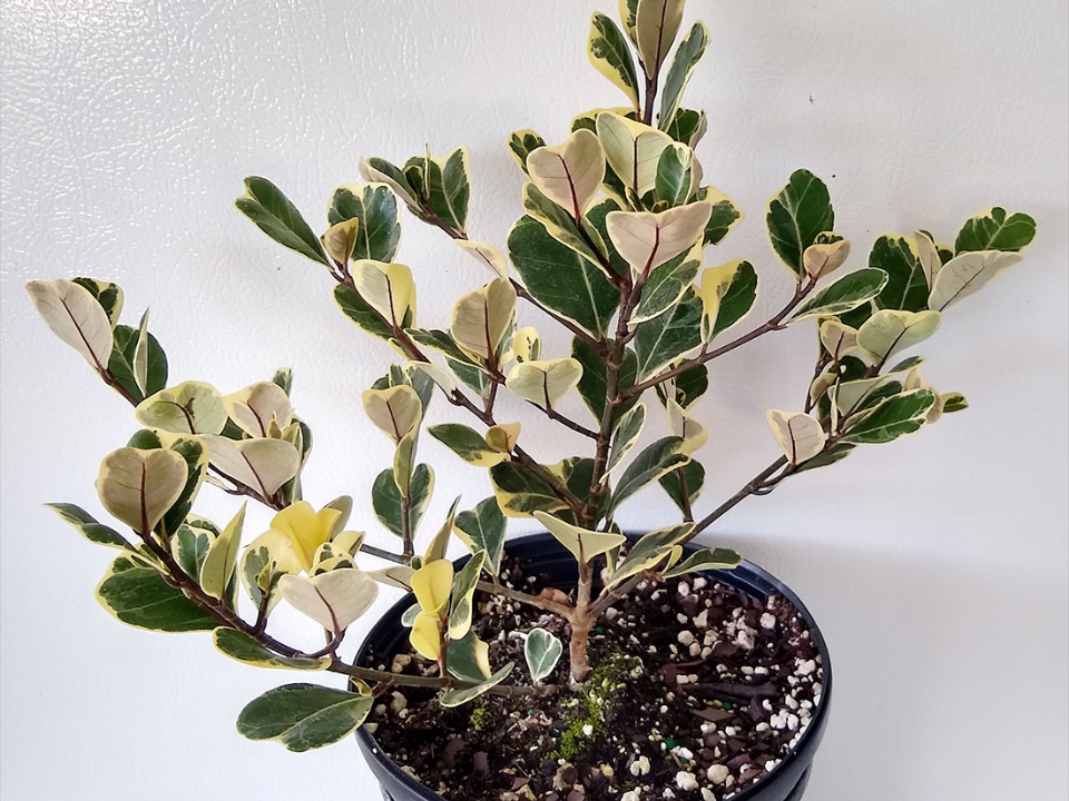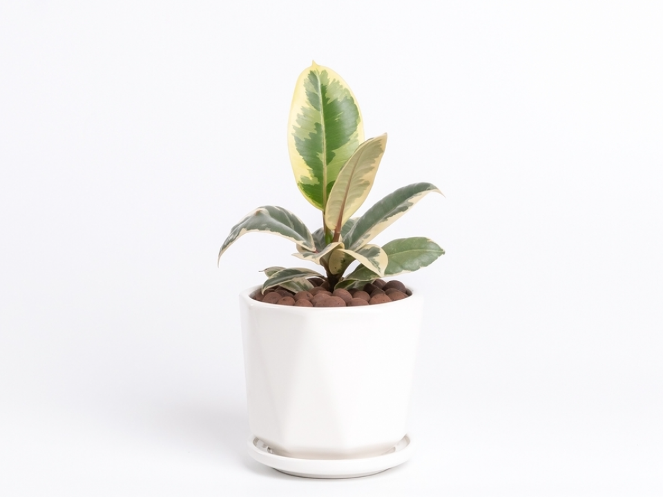 The Variegated Rubber Plant (Ficus elastica) is a bold and attractive houseplant that makes a statement on any windowsill. Its large, glossy leaves are a deep green with creamy or yellowish variegation, creating a striking contrast. This plant can grow quite tall, so it is an excellent option for those with plenty of space.