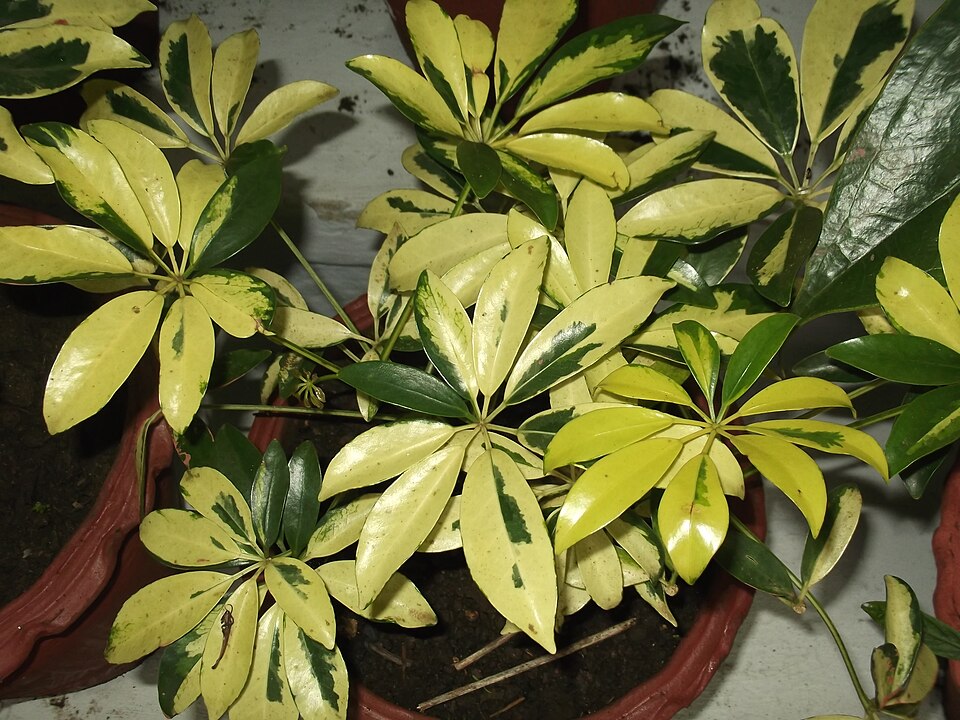 Schefflera, also known as the umbrella plant, is a striking plant with large, glossy leaves that have a beautiful variegation of yellow or white. The variegated version of this plant offers a fresh and lively look, with its bright colors adding a pop of contrast to the darker green foliage.