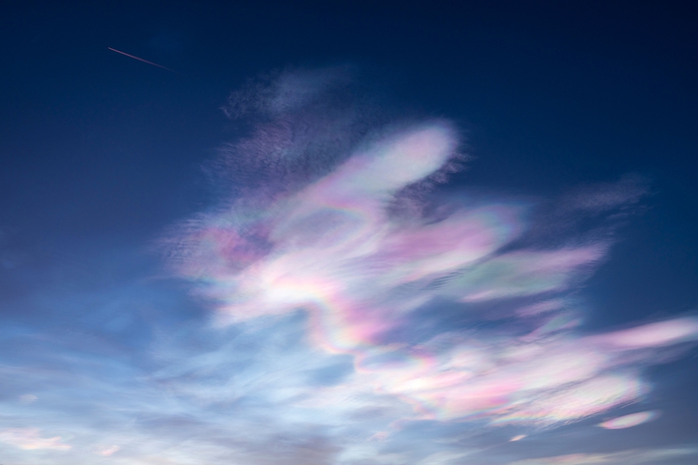 Cloud iridescence is a captivating phenomenon where light diffracts off tiny water droplets or ice crystals, creating a soft, colorful effect. This rare occurrence happens when the light interacts with specific cloud types, usually cirrus clouds, at high altitudes. Iridescent clouds can appear in pastel colors, often creating an ethereal glow in the sky. This rare optical illusion is hard to catch, as it requires the right combination of clouds, light, and atmosphere.