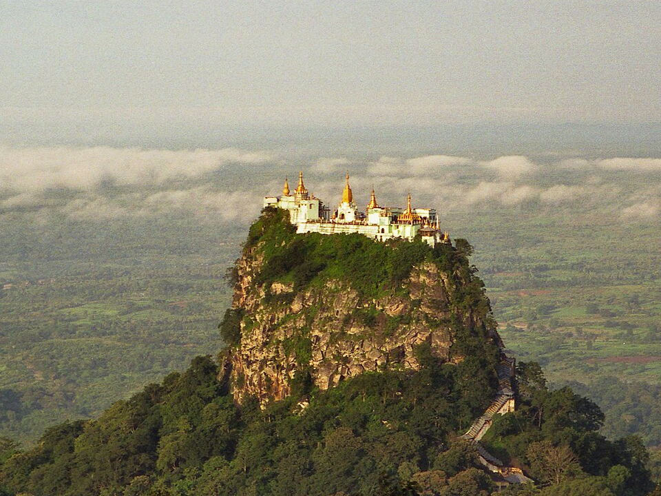 Perched atop an extinct volcano, Taung Kalat Monastery overlooks the plains of Bagan. Pilgrims climb hundreds of steps to reach its golden pagodas, often accompanied by curious monkeys along the way. The monastery is believed to be protected by powerful spirits known as Nats.