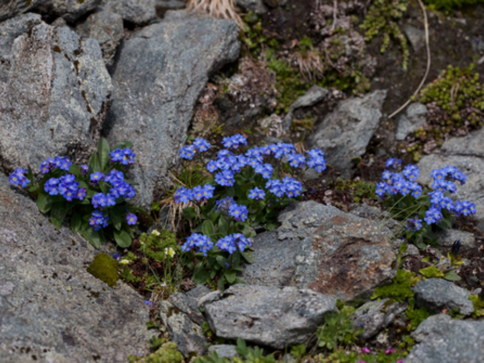 Alpine forget-me-not is capable of enduring extreme weather, making it a valuable member of cliff-side ecosystems. Its flowers bloom during the brief summer months, attracting pollinators to these otherwise inhospitable areas. The plant is a symbol of resilience, adapting to life in nutrient-poor, rocky soils. Its beauty contrasts with the stark, rocky cliffs where it grows.