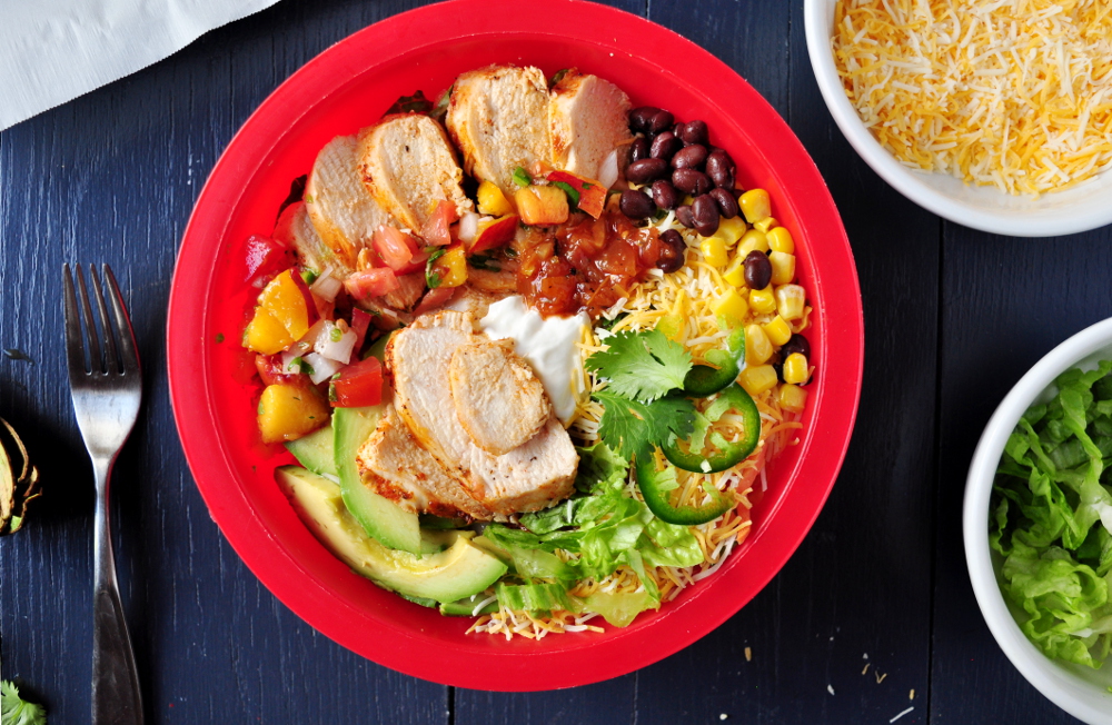 Cook 2 cups of rice and mix it with 1 tablespoon lime juice, 2 tablespoons chopped cilantro, and a pinch of salt. Season 1 pound of chicken breast with 1 teaspoon chili powder, 1 teaspoon cumin, 1/2 teaspoon garlic powder, and salt, then cook and slice it. Fill bowls with rice, 1 cup black beans, 1 cup corn, the chicken, salsa, shredded lettuce, and shredded cheese. Add sour cream, avocado, or extra lime if you like, then serve while the chicken is still warm.