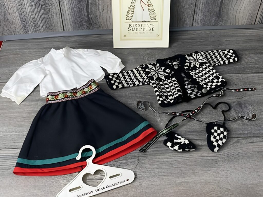 Kirsten Larson’s Winter Outfit, which includes a skirt, blouse, and wool accessories, was part of her wardrobe in the 1990s. Retired in 2011, it is now valued at $90 to $180. This outfit is beloved by collectors because it highlights Kirsten’s pioneer life and fits the historical context of her character’s story. The winter theme makes it an ideal piece for collectors who enjoy displaying dolls in seasonal settings.