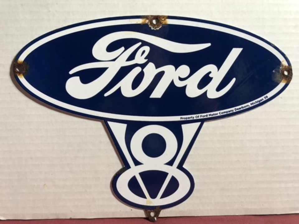 This vintage porcelain sign from Ford, featuring the iconic V8 logo, was used by dealerships and service stations to advertise the Ford brand. The sign likely dates back to the 1940s or 1950s and is characterized by its bright red and blue enamel colors. Collectors value the V8 logo for its historical significance and the Ford brand’s association with American automotive history.