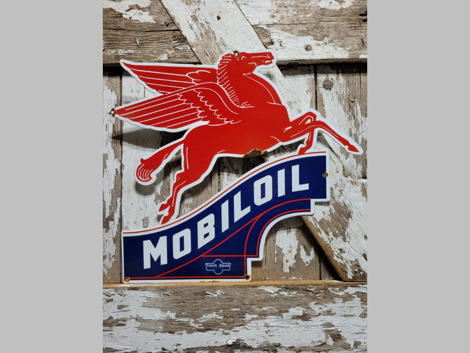 Original Mobilgas Pegasus porcelain signs can be valued between $400 and $700, depending on their size and condition. Larger signs with well-preserved bright colors can push the price even higher. Collectors particularly look for these signs in pristine condition, as the bright red and white Pegasus design makes them stand out in any collection.