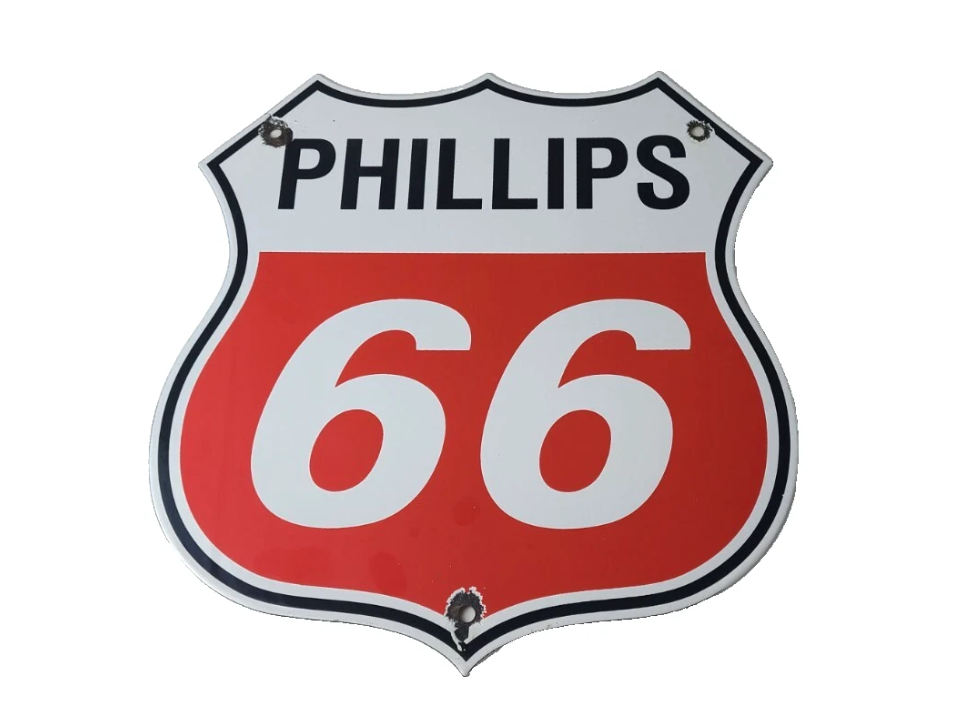 Phillips 66 produced these porcelain signs to advertise their service and parts departments in the mid-20th century. The bright red and white color scheme and the iconic Phillips 66 shield logo make this sign instantly recognizable. The sign was a prominent feature in many Phillips service stations, signaling both gasoline and auto repair services.