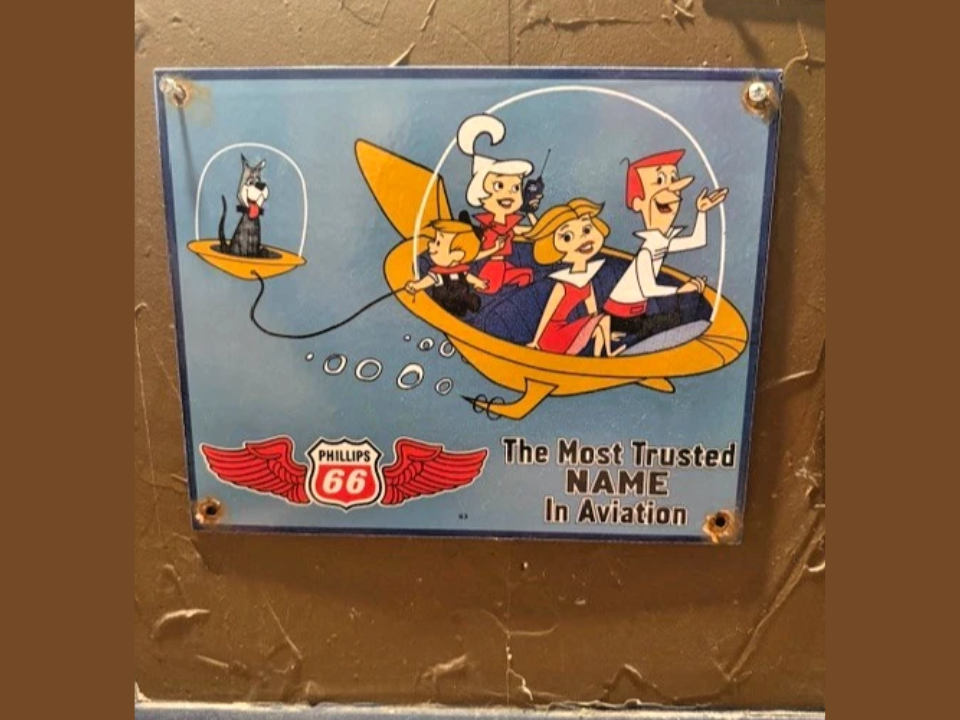 This unique Phillips 66 porcelain sign, bearing the Jetsons motif, was produced in 1963 and features a vintage, mid-century design. The Jetsons-themed graphic is part of a series of signs produced by Phillips to target the future-focused generation of car buyers, and it combines automotive branding with a popular cultural reference. This sign stands out due to its rare design and nostalgic appeal, making it a highly sought-after collector’s item.