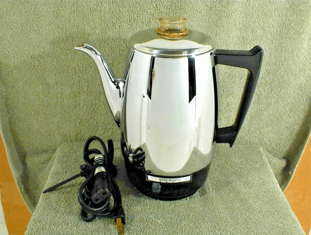 The GE Automatic Percolator from the 1960s brewed coffee with a gentle bubbling sound. Many families relied on it for morning routines. The stainless steel body kept it looking polished. It produced a rich, hot cup that many still appreciate. Working models often sell for $50 to $120.